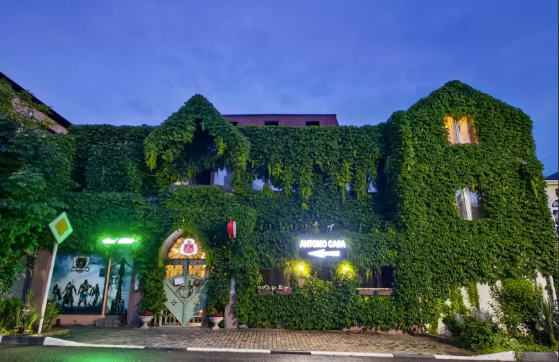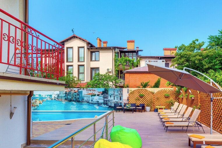 Отель в сердце микрорайона Толстый Мыс. Экстерьер здания напоминает старые средиземноморские виллы. По фасаду плетется виноград. В гостинице работает бесшумный лифт. Для посуточной аренды предлагаются комнаты на 2-4 человек. Стандартные удобства – мини-бар и сейф. В номерах «комфорт» имеются просторные террасы. В «люксе» два этажа и балкон с видом на тихую улицу. В 800 метрах от отеля находится новая набережная на Круче.