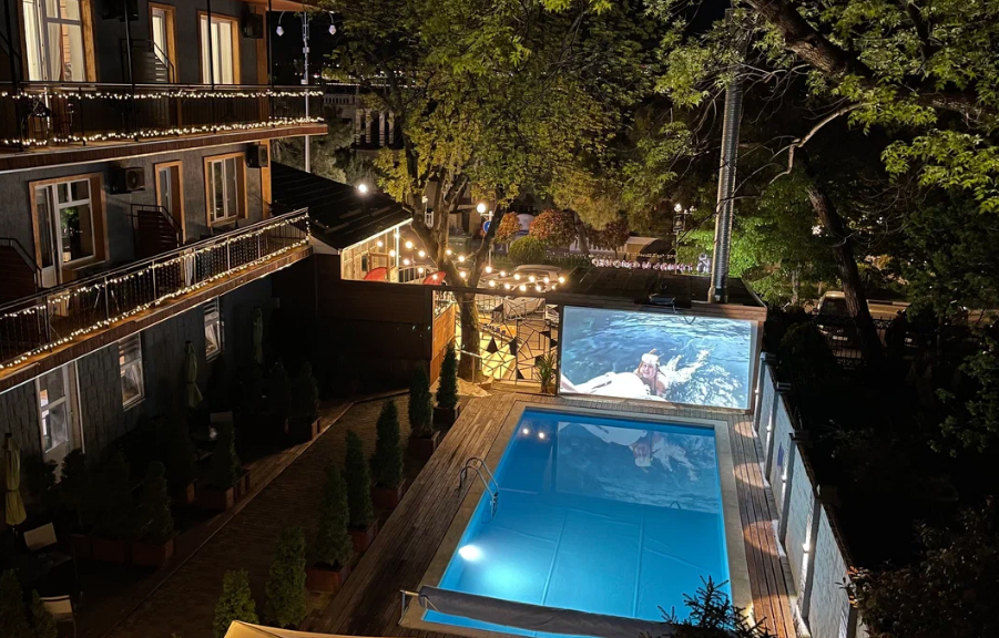 Находится в самой оживленной части Толстого мыса. У гостиницы закрытая территория. Во дворе есть бассейн и зоны для пляжного отдыха. Номера с дизайнерским ремонтом обладают вместимостью до 7 человек. В некоторых комнатах есть балконы. В апартаментах «студио» оборудованы кухня и сауна. Дополнительно предлагается прокат самокатов и велосипедов. У администратора можно получить актуальный список экскурсий.