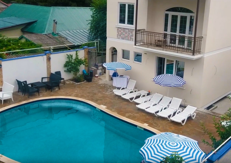 Находится на тихой улице с хорошей транспортной доступностью. До моря – несколько минут спокойным шагом. В гостиничном фонде имеются номера разных категорий. В комнатах «стандарт» есть телевизоры и сплит-системы. «Люксы» отличаются улучшенной отделкой и дополнительными удобствами. В стоимость проживания включено пользование общей кухней. На улице имеются зоны отдыха с беседками. Платные опции – прокат пляжного инвентаря, поездки к достопримечательностям.